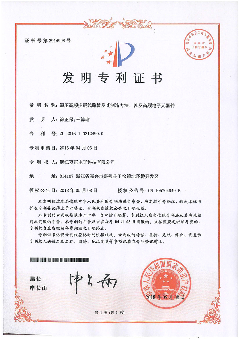 热烈祝贺公司成功取得“发明专利—混压高频多层线路板及其制造方法、以及高频电子元器件”证书