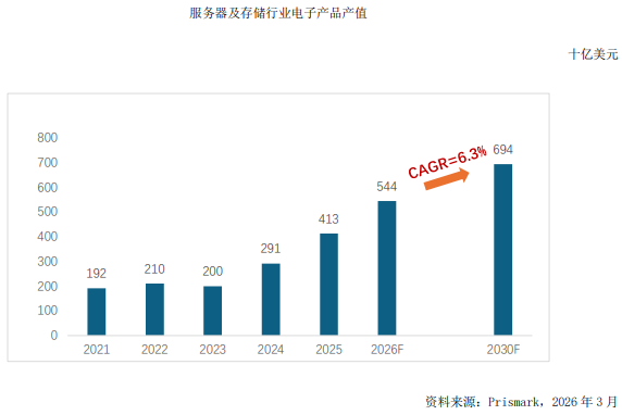 根据Prismark估算,2025年全球服务器及存储领域市场规模为4,130亿美元,较2024年大幅增长41.9%,预计2026至2030年复合增长率为6.3%,2030年市场规模将达6,300亿美元。