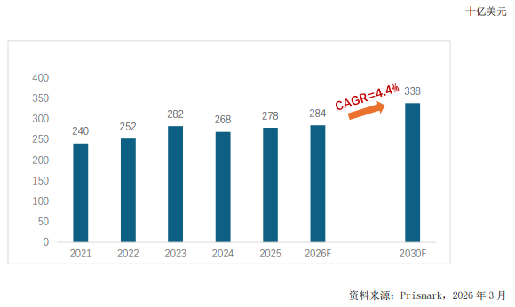 根据Prismark估算,2025年全球汽车行业电子产品市场规模为2,780亿美元,较2024年增长3.7%,2026年至2030年复合增长率为4.4%,预计2030年全球汽车行业电子产品市场规模将达到3,380亿美元。