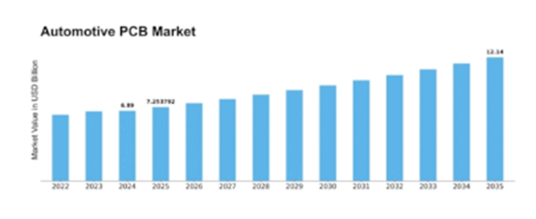 据市场研究未来公司(MRFR)分析,2024年全球汽车PCB市场规模达68.9亿美元;2025年市场规模预计为72.54亿美元,预计2025-2035年期间,市场将以5.28%的复合年增长率增长,到2035年规模将突破121.4亿美元。