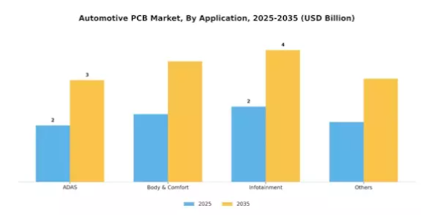 汽车PCB市场的应用领域主要包括高级驾驶辅助系统、车身与舒适性系统、信息娱乐系统及其他领域,各领域市场占比分布各异。其中,高级驾驶辅助系统因车辆安全与自动化发展需求,占据最大市场份额;信息娱乐系统虽当前市场占比相对较小,但受消费者对高端多媒体、网联功能需求增加的驱动,实现高速增长。