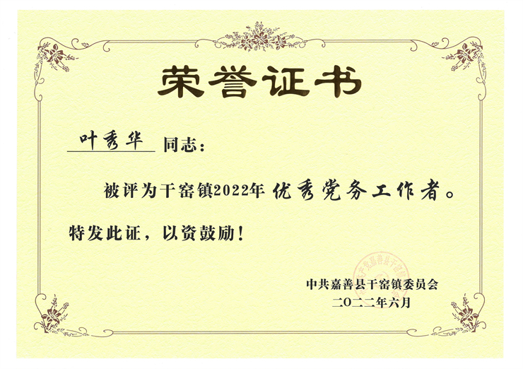 热烈祝贺公司叶秀华同志荣获干窑镇2022年“优秀党务工作者”